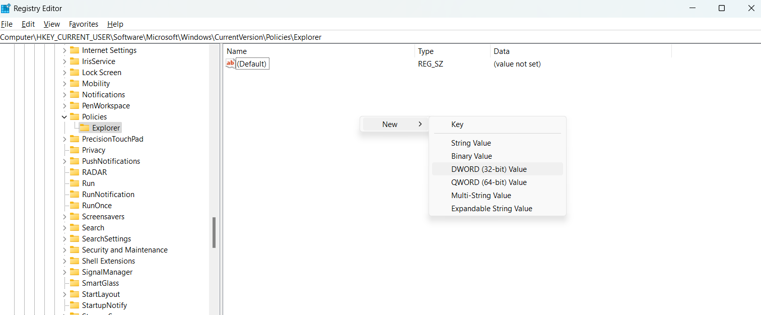 - 将此键命名为 '探险家'。现在,在这个键中,右键单击空白处并选择新建 > DWORD(32 位)值。