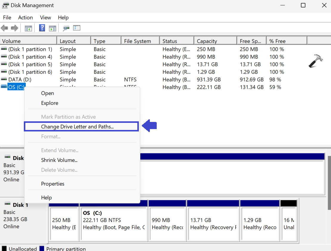您的 SSD 未显示,因为 SSD 的驱动器盘符丢失或与其他磁盘冲突,并且 Windows 无法识别它。请按照以下步骤在 Windows 磁盘管理中为 SSD 分配新的驱动器盘符: