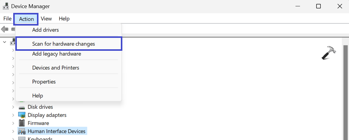 之后,转到“行动”选项卡并单击“扫描硬件变化”。
