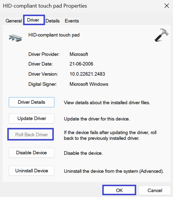 如果您在驱动程序更新后遇到 Windows 11 中触摸板设置消失的情况,请考虑回滚到以前版本的触摸板驱动程序。
