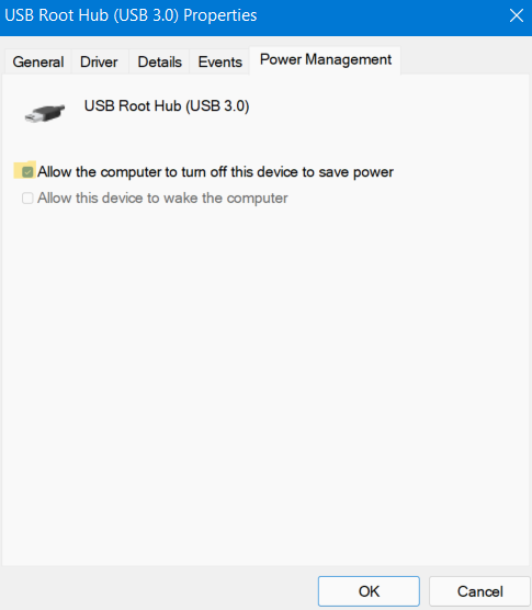 3。在电源管理选项卡,未标记在旁边的盒子允许计算机关闭此设备以节省电源。一旦未选中,请按好的。