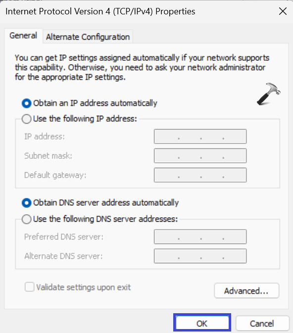 4. 现在,选择“自动获取IP地址”选项并单击“确定”。