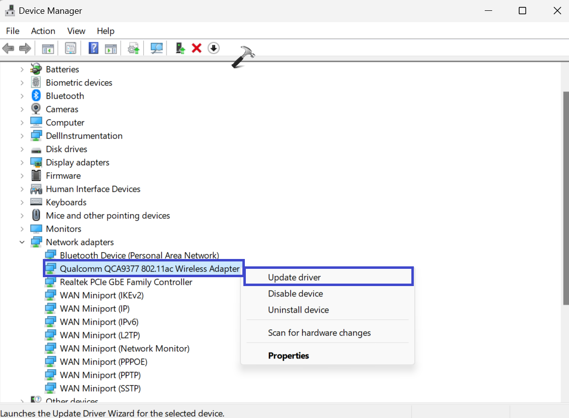 右键单击您的网络适配器并选择“更新驱动程序”。