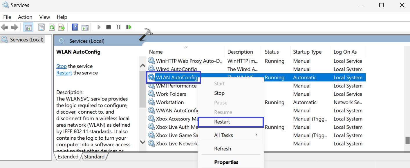 2. 右键单击“无线局域网自动配置”选项并选择“重新启动”。