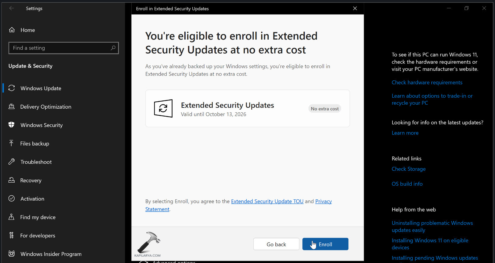 Microsoft 正在逐步推出注册 ESU 的选项。所以目前,它可能对某些用户可用,而对其他人可能不可用。此注册选项的出现有一些基本要求。首先,我提到这些要求。您需要确保您的系统满足以下要求: