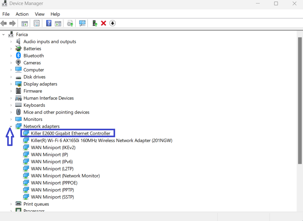 - 接下来,展开网络适配器通过单击旁边的箭头来选择选项。
