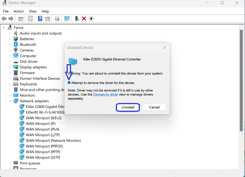 - 现在,勾选复选框尝试删除该设备的驱动程序。然后,单击卸载。