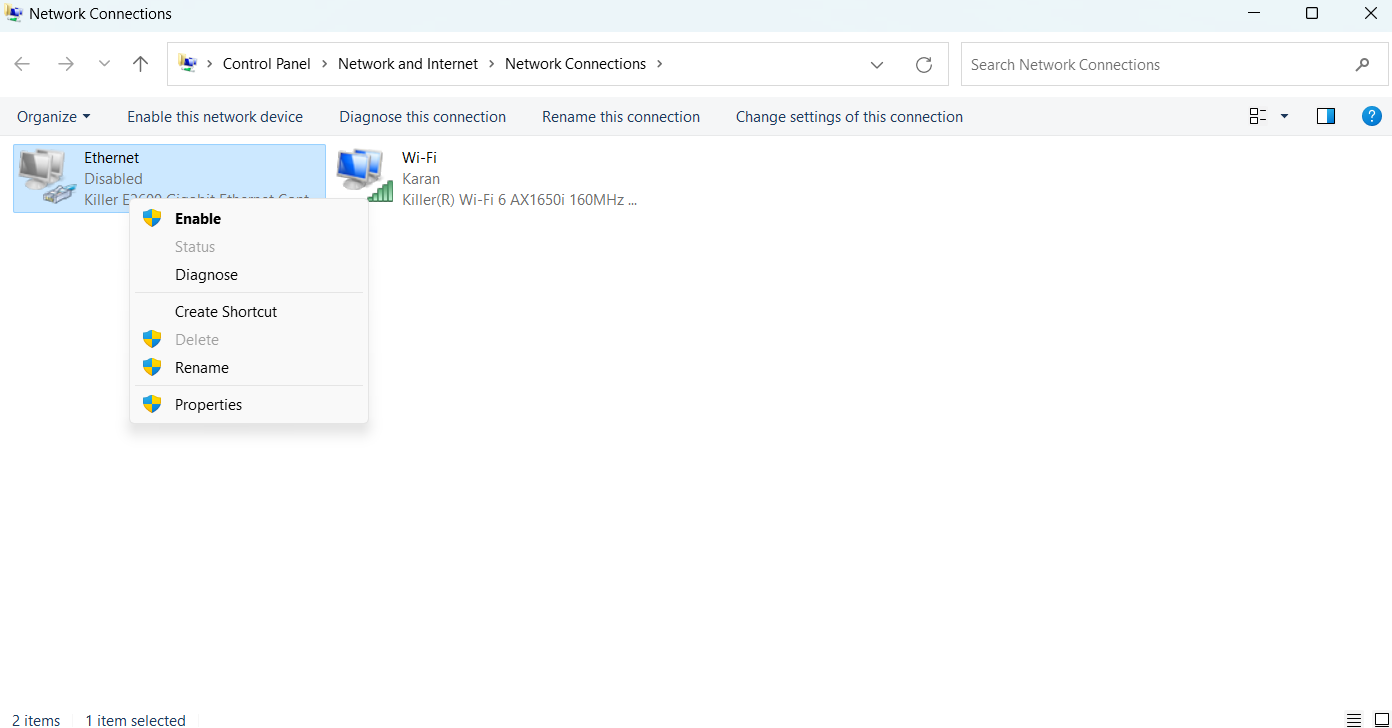 - 如果以太网适配器呈灰色,然后右键单击它并单击使能够。
