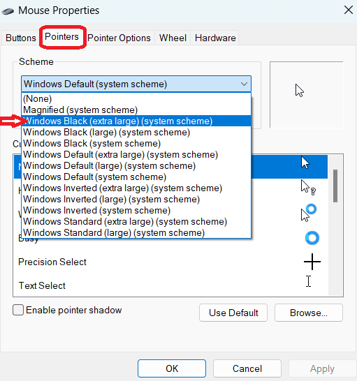4. 选择“指针”选项卡 > 单击“方案”选项中的下拉箭头。