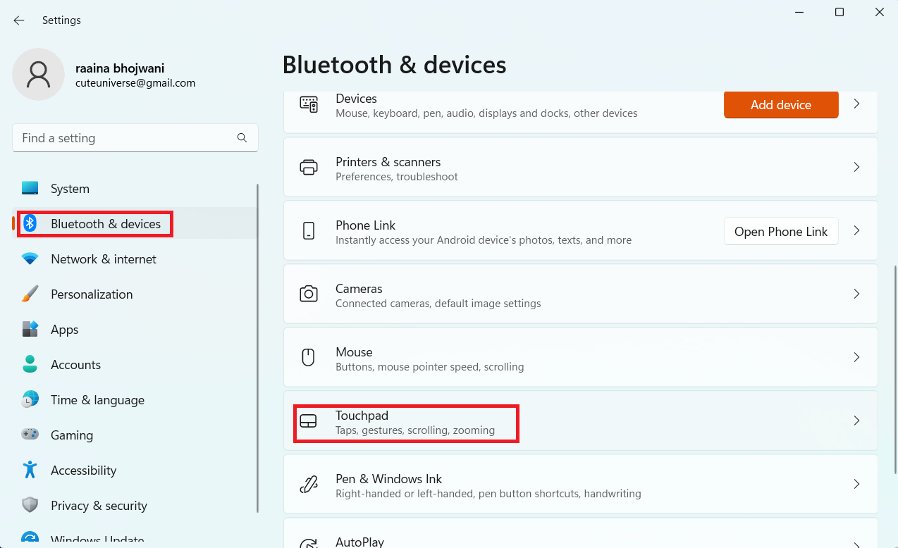 2. 选择“蓝牙和设备”选项 > 触摸板。