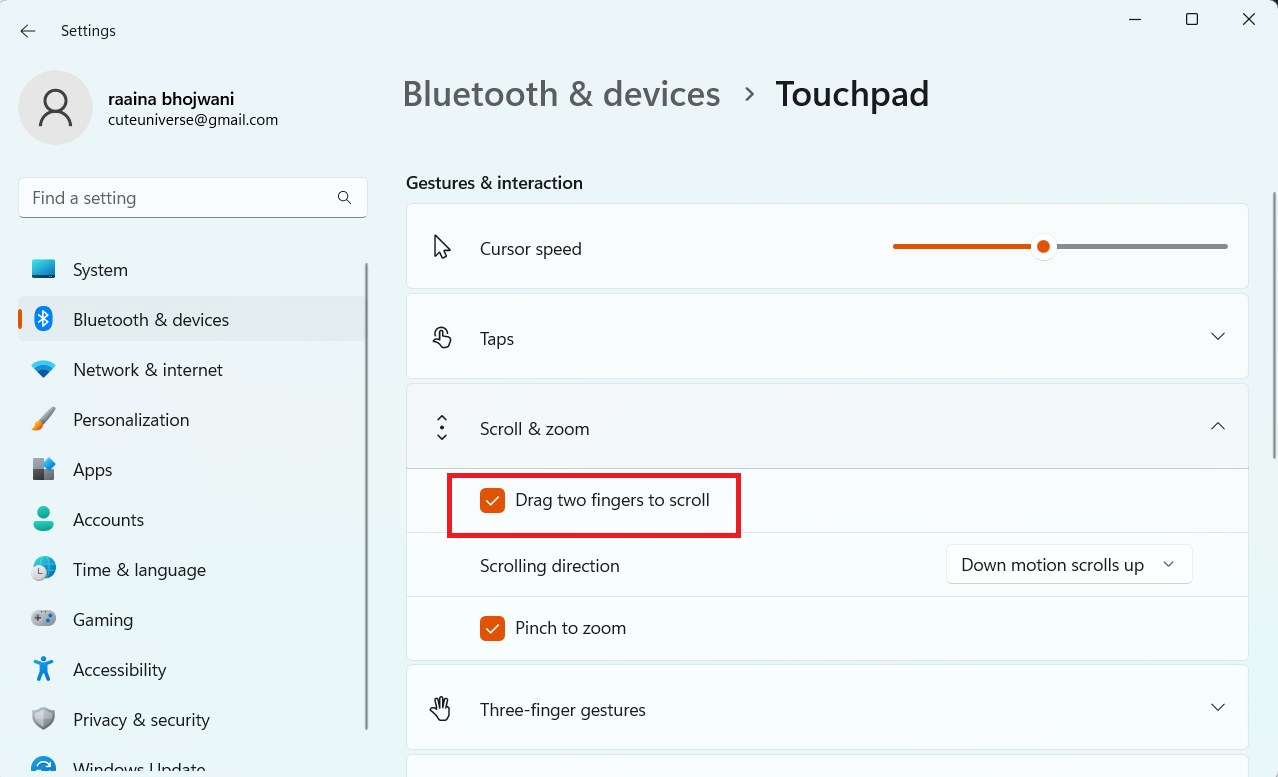 3. 单击“滚动和缩放”> 单击“拖动两根手指滚动”复选框。