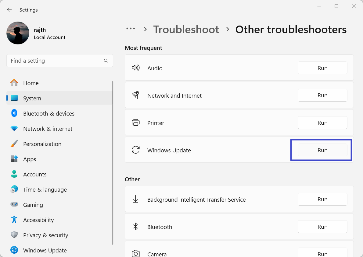 3. 单击“跑步”旁边的按钮Windows 更新。