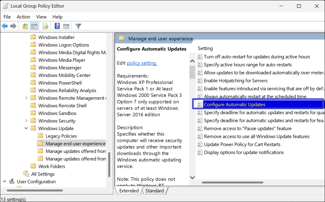 计算机配置 > 管理模板 > Windows 组件 > Windows 更新 > 管理最终用户体验