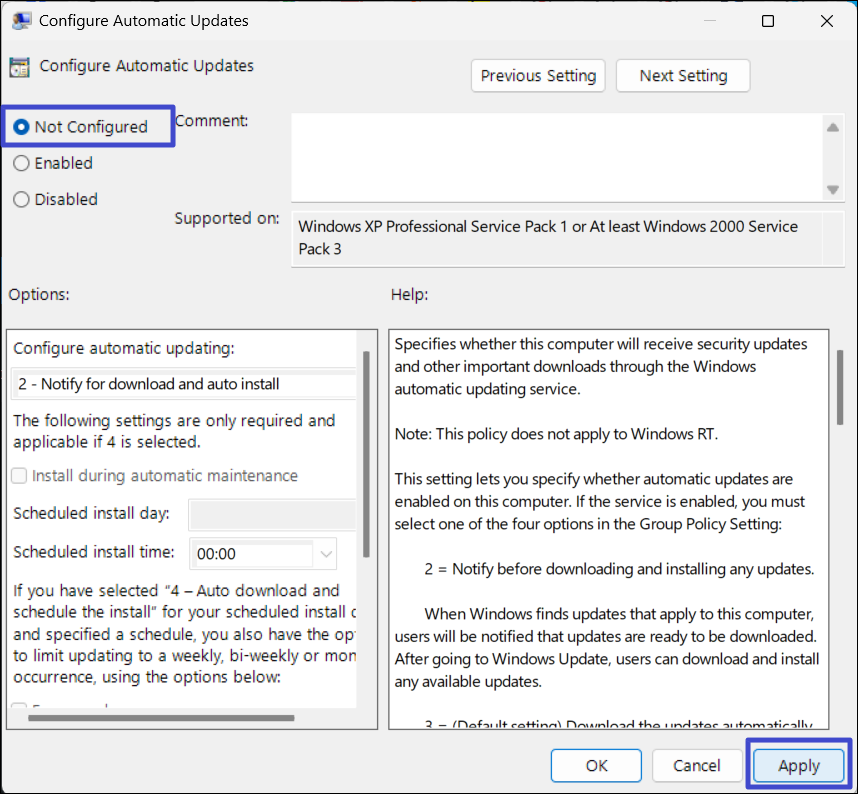 4. 现在,选择“未配置”并点击“申请“。 然后, ”好的”。