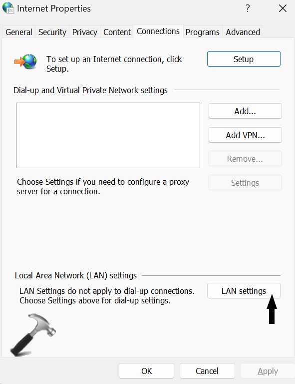 3. 单击连接选项卡,然后单击局域网设置在局域网 (LAN) 设置下。