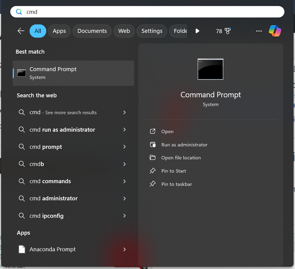 步骤一:单击 Windows 搜索栏并输入“CMD”,然后右键单击“命令提示符”并从上下文菜单中以管理员身份运行。