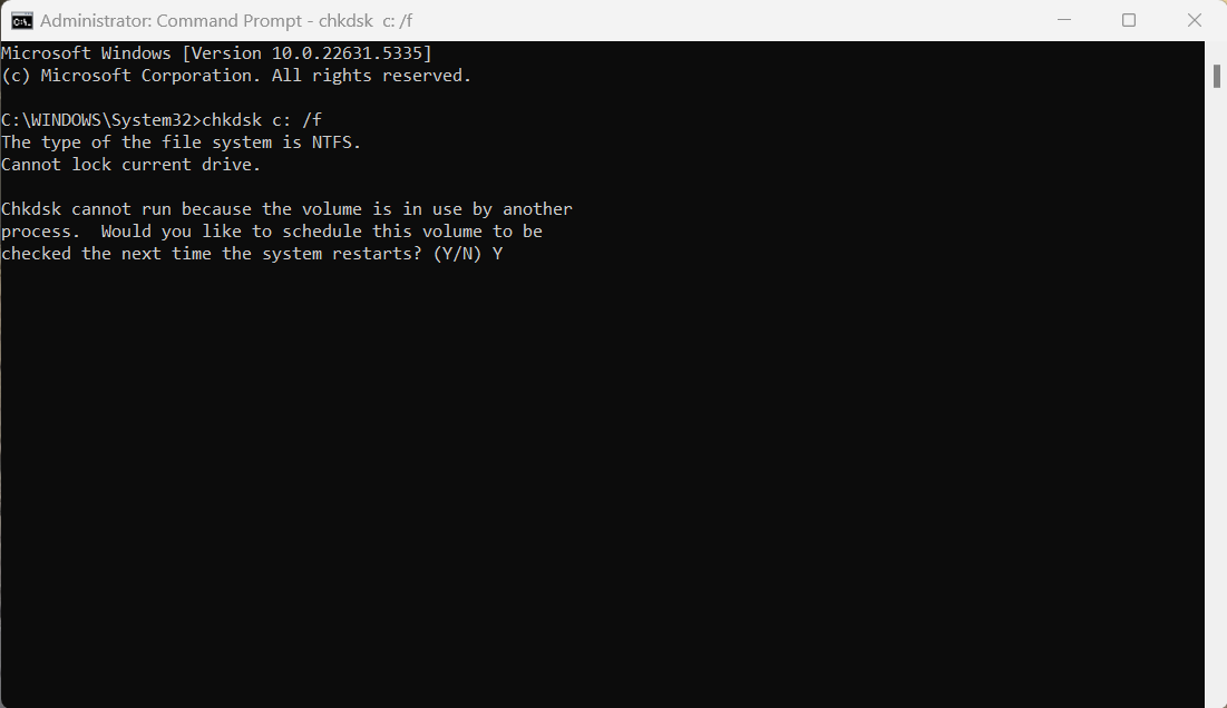 确保您的磁盘没有损坏。您可以使用管理命令提示符执行检查,如下所示。