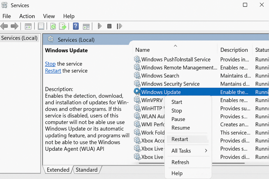 步骤2:在列表中找到 Windows Update,右键单击 Windows Update,然后从上下文菜单中选择重新启动,然后等待服务重新启动。