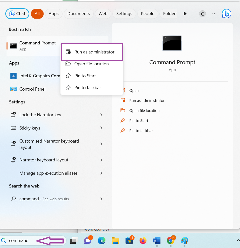 1. 搜索命令提示符在搜索栏中。然后右键单击并选择以管理员身份运行。