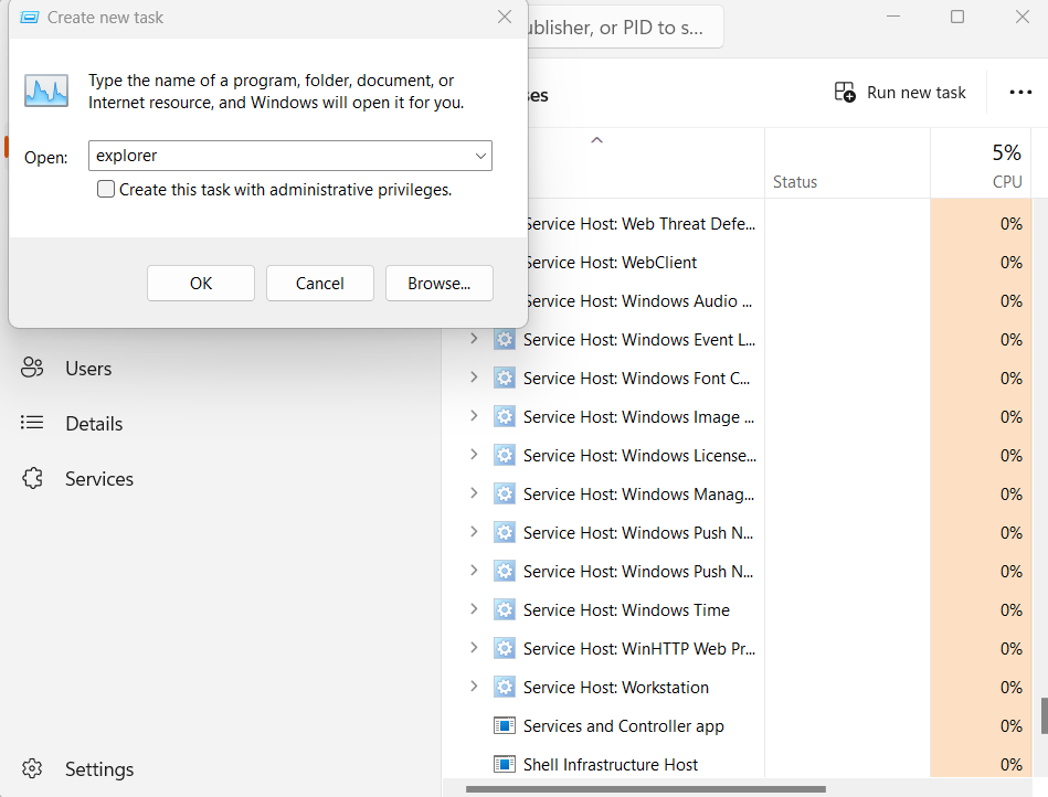4. 输入资源管理器创建新任务窗户。另外,请检查使用管理权限创建此任务。