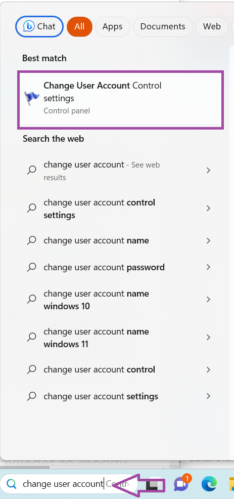 1. 打开更改用户帐户控制通过在搜索栏上搜索它。
