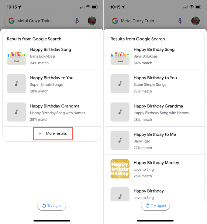 如果您没有收到任何匹配的歌曲,您可以点击再试一次正是这样做。如果您仍然遇到困难,请尝试消除背景噪音,提高嗡嗡声的音量,并为 Google 提供足够的声音至少 10 到 15 秒。