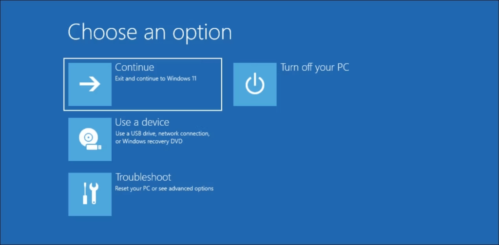 步骤4:在 Windows 恢复环境中单击“继续”以重新启动 Windows。登录屏幕现在应显示管理员帐户。