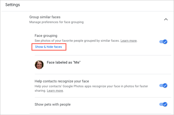 - 打开开关人脸分组。或者,您可以启用以下开关:帮助联系人识别您的面孔和与人一起展示宠物。