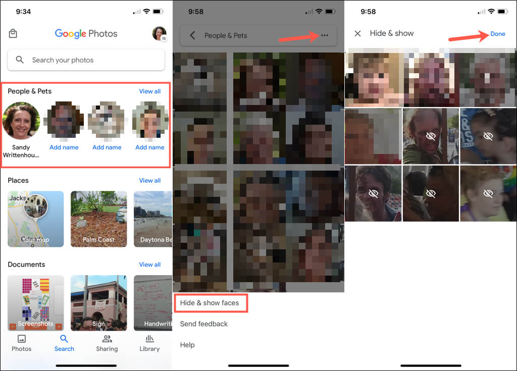 如果您稍后改变主意并想要取消隐藏 Google 相册面孔,请按照相同的步骤返回到此位置。然后,选择脸部以删除图标并再次显示脸部。