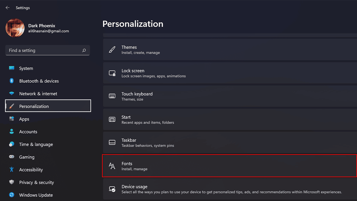 - 打开设置> 点击个性化> 向下滚动 > 单击字体。