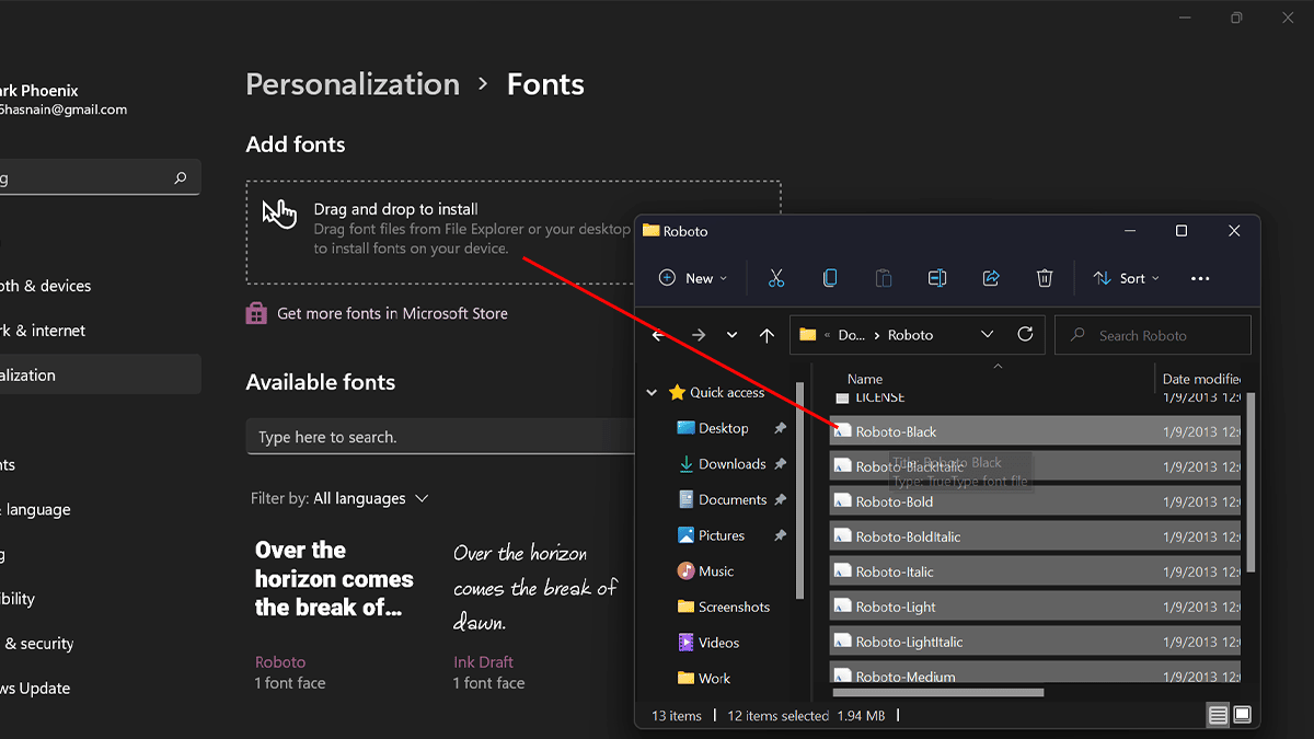 - 选择所有文件并将其拖放到拖放即可安装安装字体的框。
