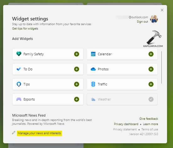 2。在小部件设置中,单击管理您的新闻和兴趣链接在左下角。