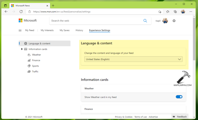 3。这将打开您的默认浏览器,Microsoft新闻页面将加载。在该页面中,转到体验设置选项卡。在那个标签中,语言和内容,您可以更改反馈的内容和语言。