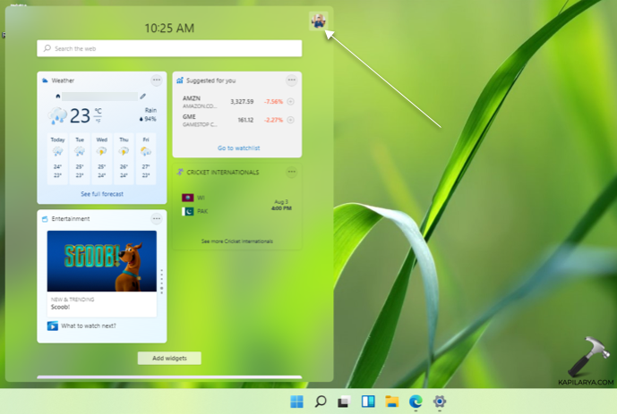 + w系统上的键打开小部件。您可以单击任务栏上存在的小部件按钮。单击小部件屏幕顶部的个人资料图片图标(请参阅下面的屏幕截图)。