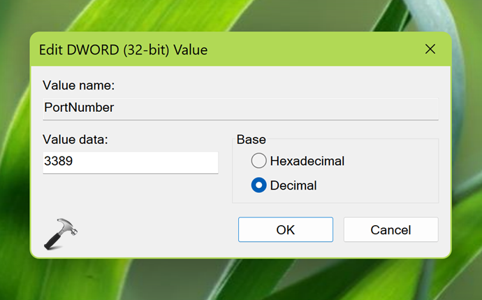 4.最后,在编辑 DWORD 值中,选择十进制基数,然后输入所需的端口号作为值数据。单击“确定”保存。