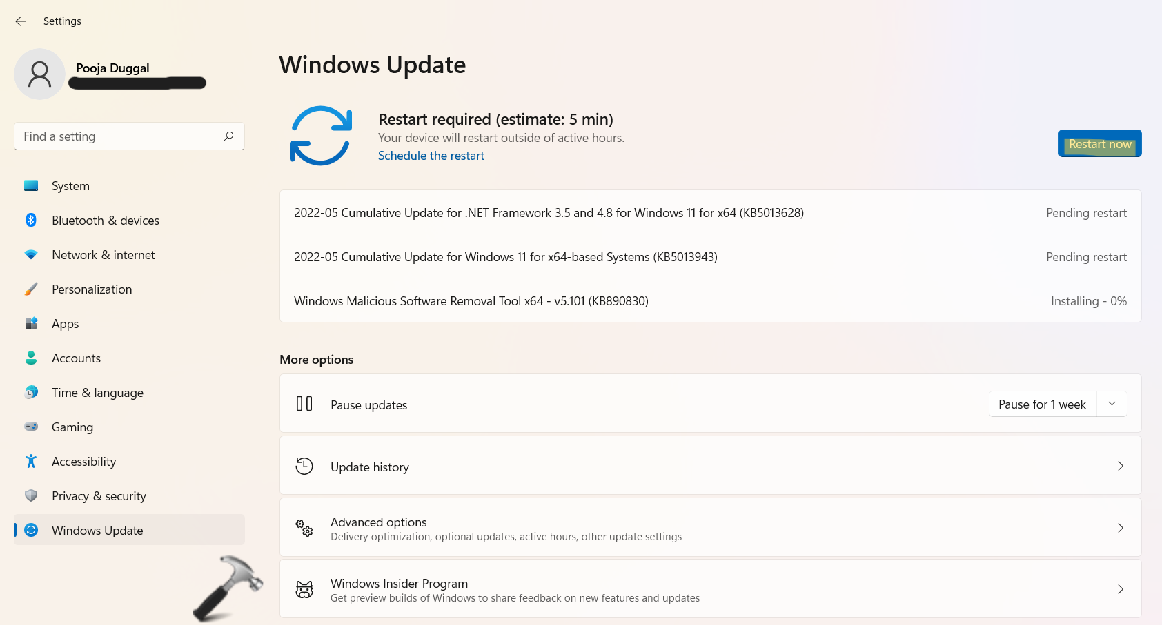因此,重新启动 Windows PC 以完成该过程非常重要。 Windows 11 将在设置的活动时间之外自动重新启动您的系统。在这种情况下,您不需要执行任何操作。