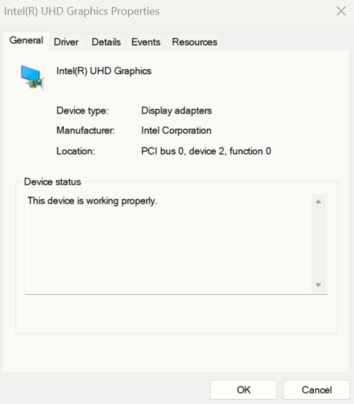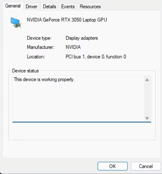任何持续存在的 GPU 问题都将在设备状态部分显示为错误代码或警告。如果没有问题,您将看到此处提到的“此设备工作正常”。
