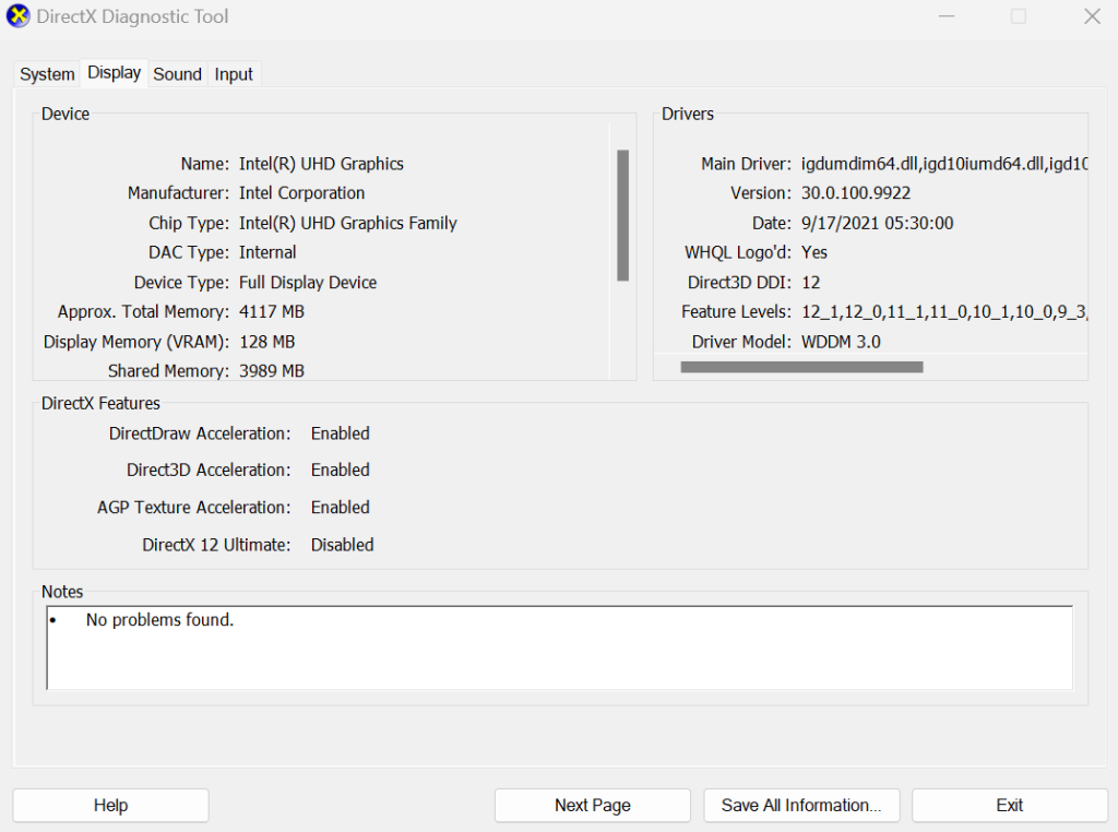DirectX 诊断工具将在此处显示任何与 GPU 相关的问题(如果有)。不过,如果一切正常,您将收到令人鼓舞的声明“未发现问题”。