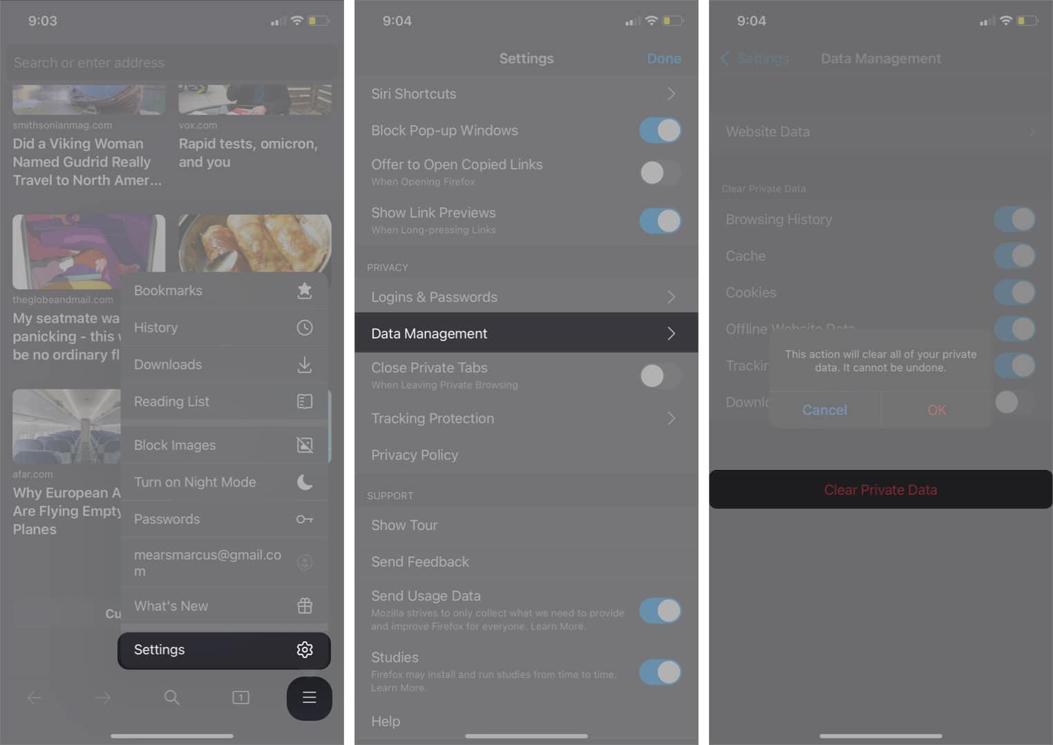 | 火狐浏览器 | 火狐 > ☰ > 设置 | 隐私 > 数据管理 > 切换缓存 > 清除私人数据 |