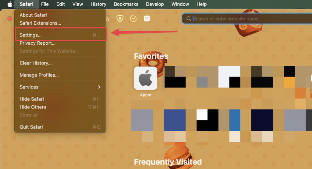 2.单击狩猎之旅Apple 标志旁边的菜单并选择设置。您还可以按命令 ⌘ + ,(逗号)在键盘上打开 Safari 设置。