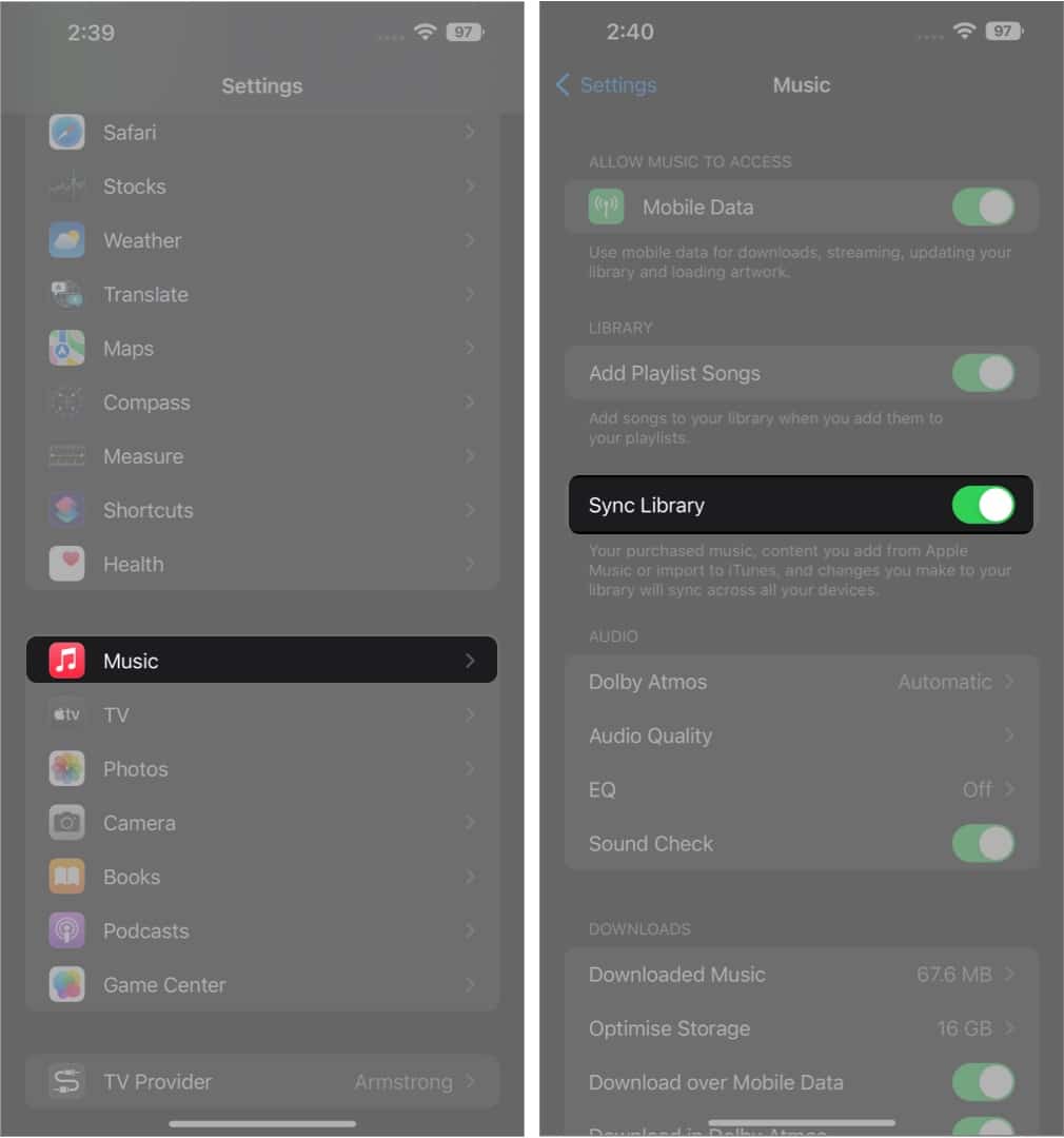 要使所有播放列表和库中的更改在所有设备上同步,请从设置中打开“同步库”开关。