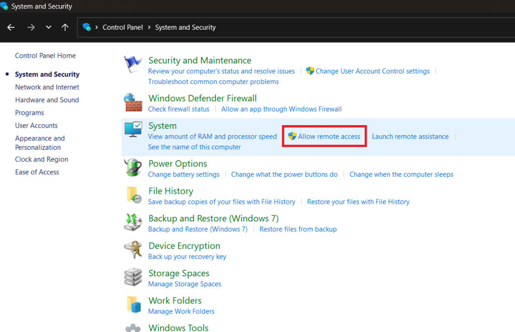 在“控制面板”窗口中,选择“系统和安全”。点击“系统”部分下的“允许远程访问”选项。