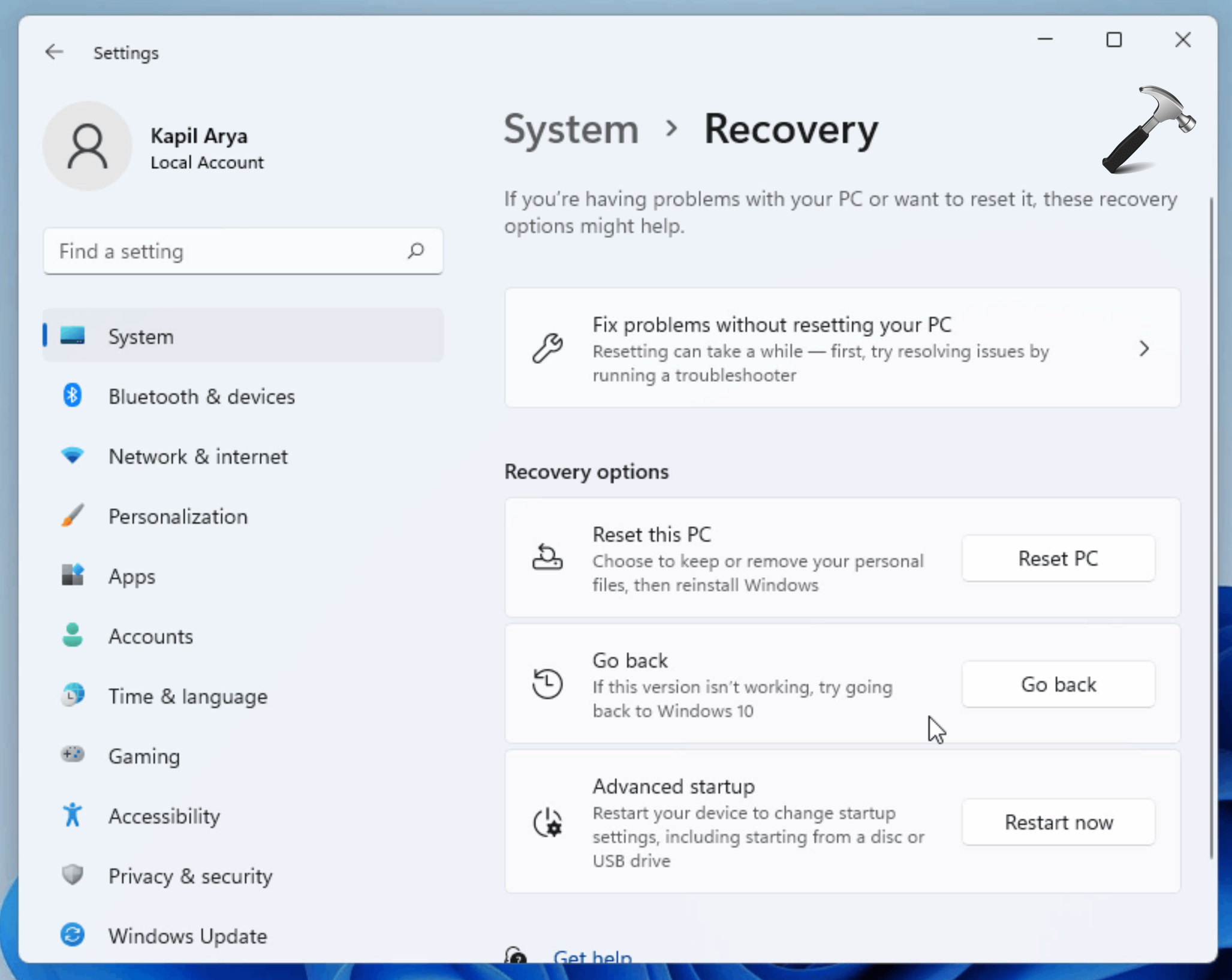 - 在恢复选项下,您会发现回去按钮,单击它。