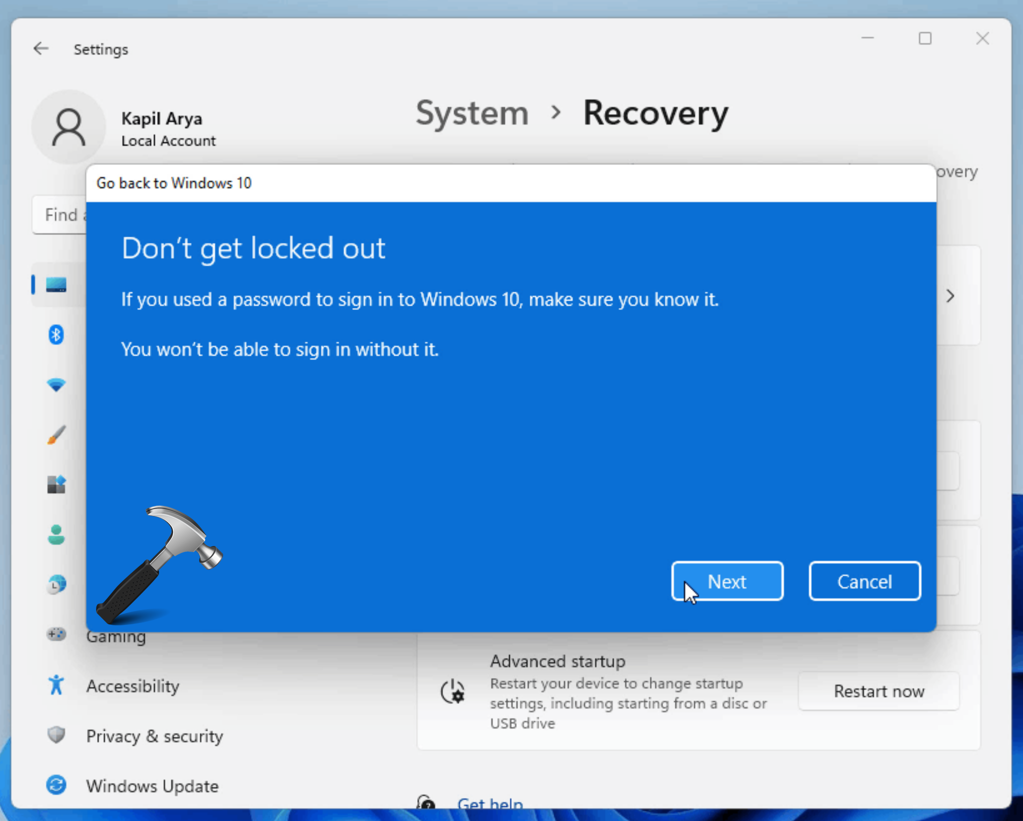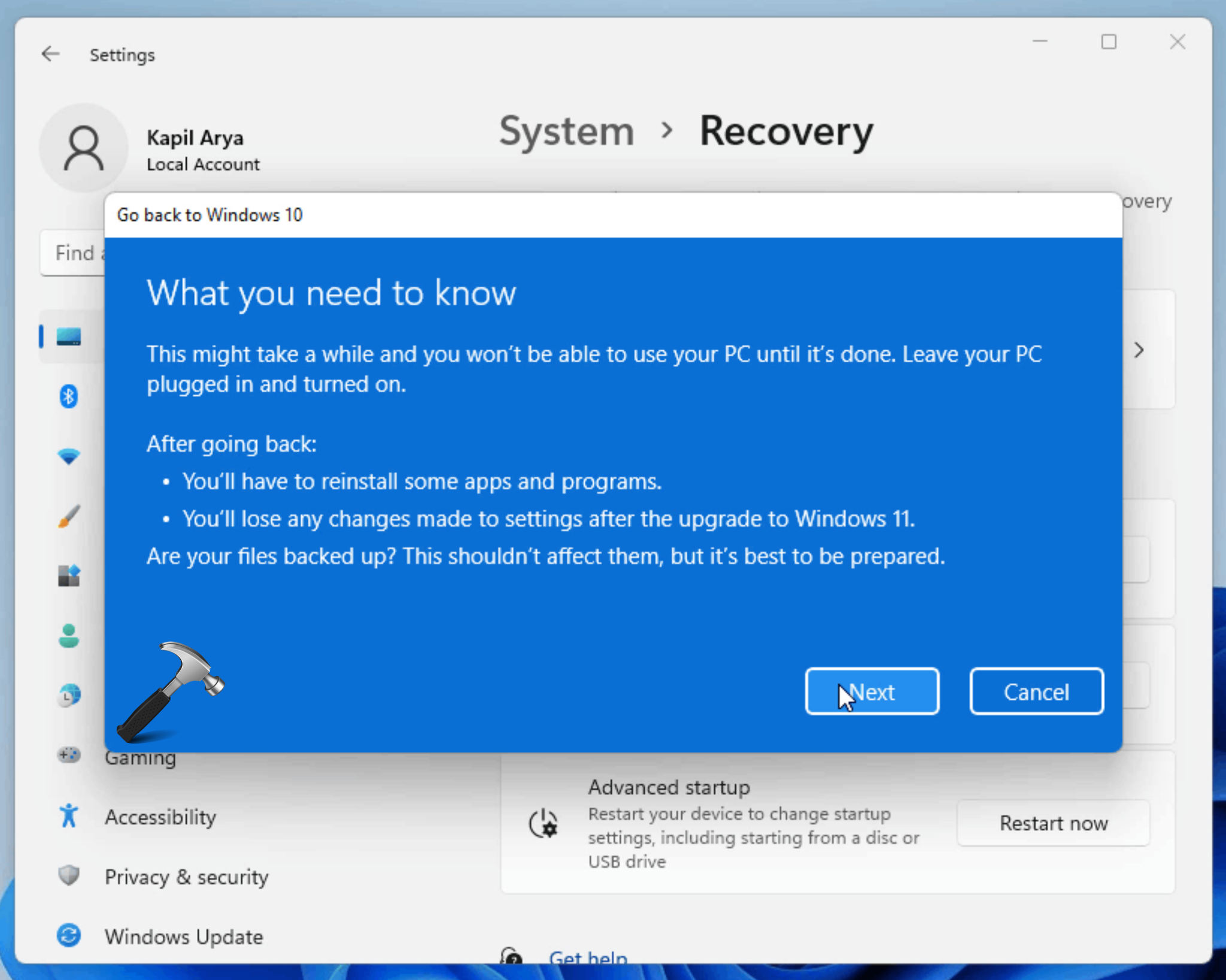 - 现在,在下一个窗口中,您将收到必须重新安装某些应用程序和程序的信息。此外,您将丢失 Windows 11 之后对设置所做的任何更改。单击“下一步”按钮继续。
