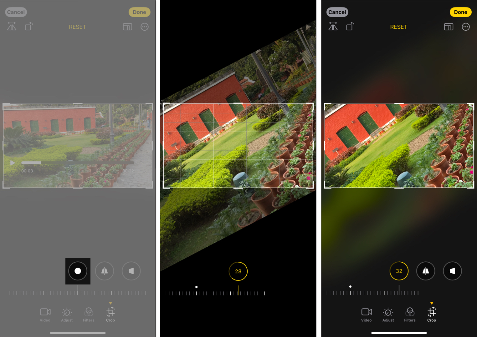 照片应用程序还允许您将视频旋转 90 度的倍数(如下所示)。点击两个半圆图标并向左或向右拖动滑块以按照您想要的方式旋转视频。这可能会严重裁剪视频的边角。