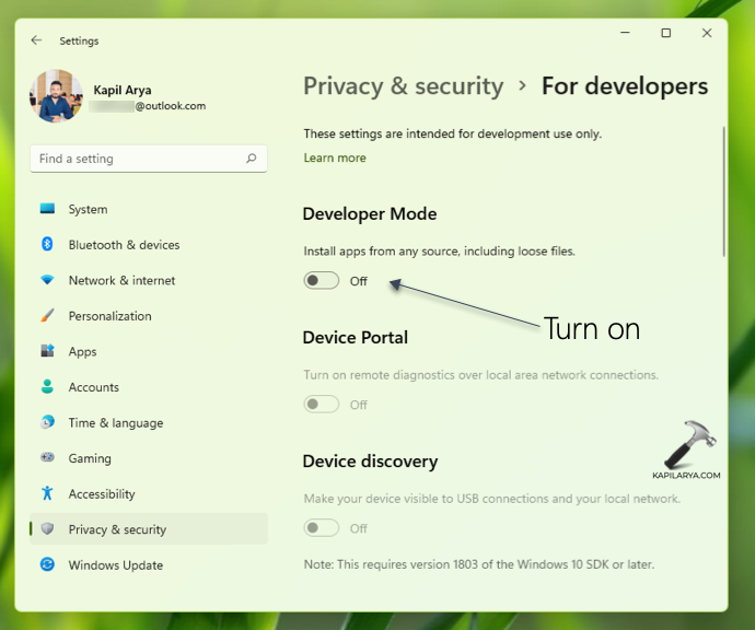 当您激活开发人员模式时,您的 Windows 11 将能够安装来自任何来源的应用程序。您应该仅在需要时启用开发人员模式。因为在开发者模式下,正如我所说,您可以从任何来源安装应用程序。因此,如果您担心安全性,请在启用开发者模式时小心,因为来自未经验证来源的应用程序可能会安装在系统上,并可能使您的设备和个人数据面临安全风险。