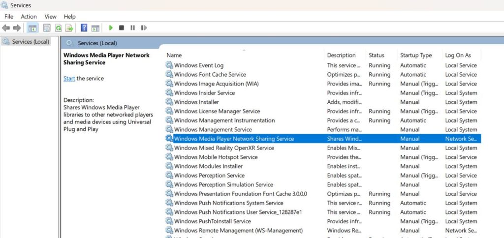 - 在“服务”窗口中,查找“Windows Media Player 网络共享”服务。双击它打开属性。