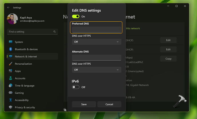 4.在编辑 DNS 设置中,打开 IPv4 和/或 IPv6 并将 DoT 服务器放入首选 DNS 字段。