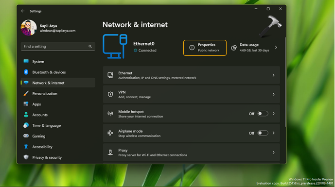2.在“设置”应用程序中,转到网络和互联网。点击特性位于您所连接的以太网/WiFi 旁边。