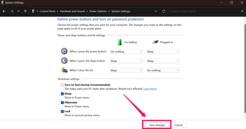 8.如果您稍后想在设备上启用快速启动功能,只需按照上述步骤操作即可选中打开快速启动复选框在关机设置部分下并保存更改。